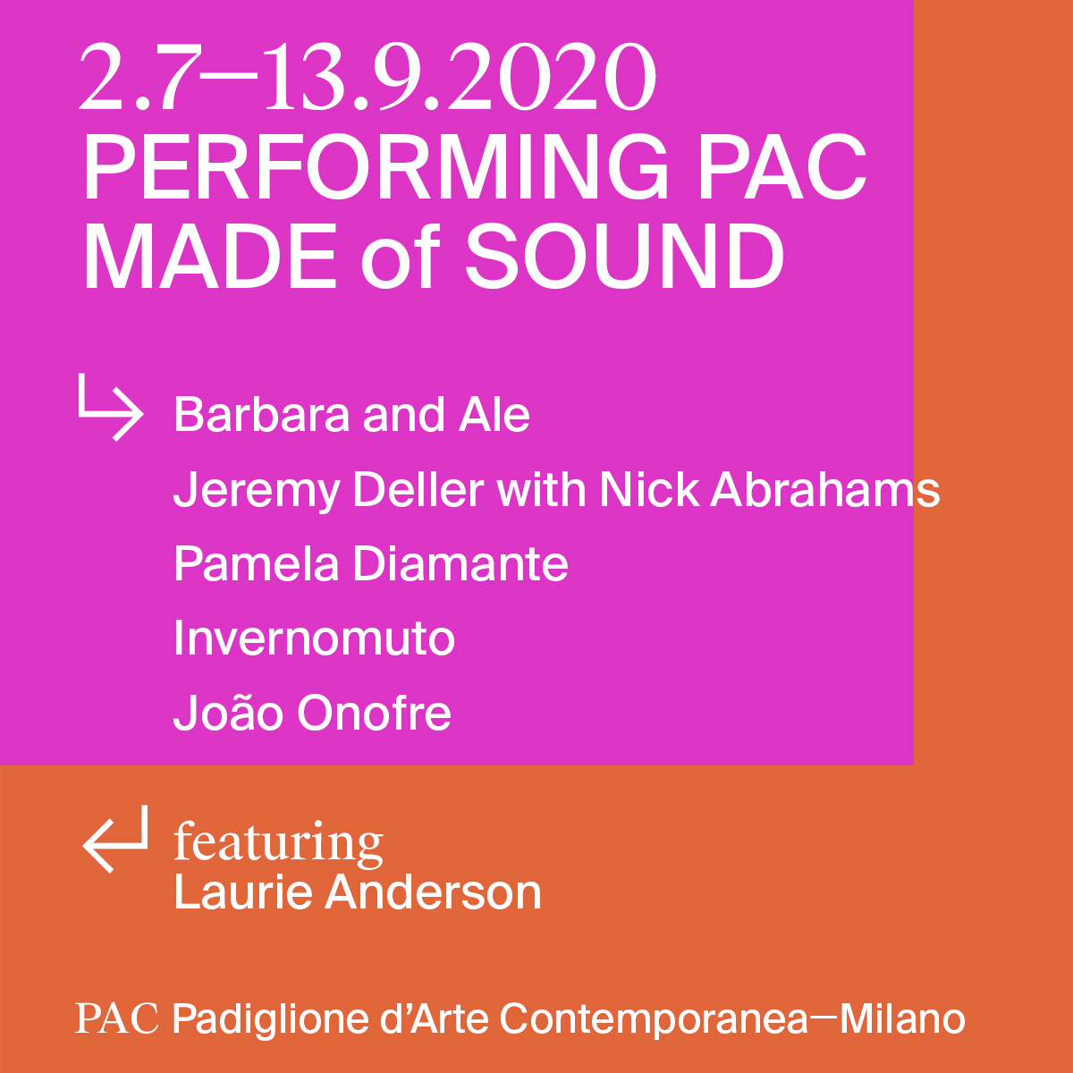 Pamela Diamante partecipa al progetto Performing PAC: made of sound a cura del Comitato Scientifico, PAC, Milano, dal 2 luglio al 13 settembre 2020.