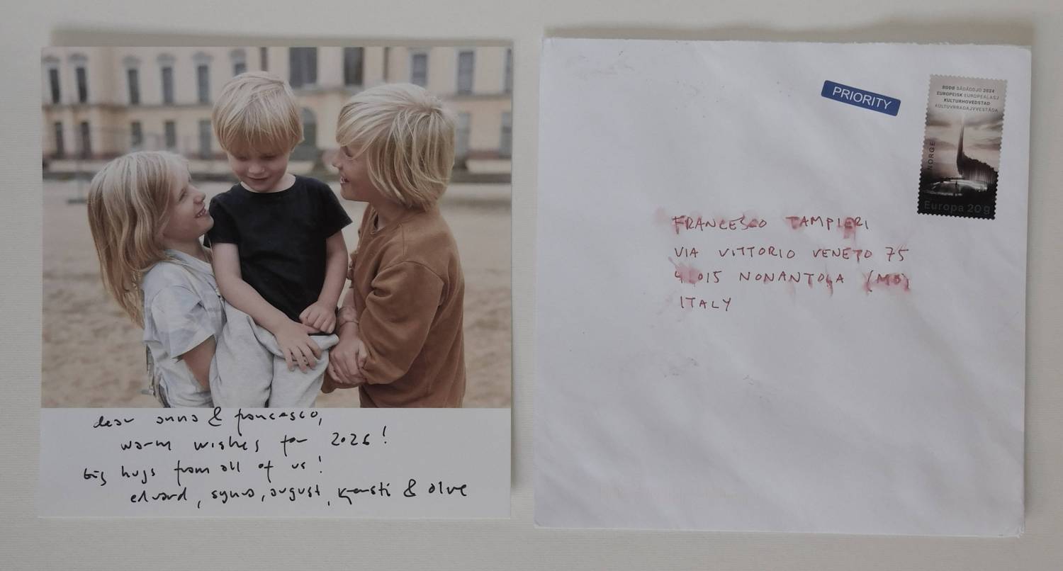 foto dei bambini con dedica a Anna e Francesco, 15.2 × 15.2 cm, busta.