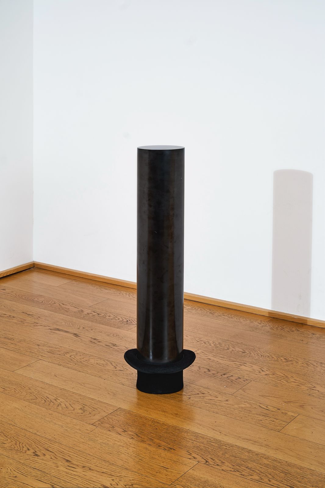 Da un cappello a cilindro di quelli usati ormai solo dai prestigiatori nei loro spettacoli, fuoriesce una colonna in marmo nero del Belgio, creando così un doppio inganno, inizialmente visivo e successivamente concettuale: è il cappello che come in un trucco di un illusionista materializza questo plinto oscuro dal suo interno, oppure è la colonna che tenta di entrare e nascondersi verticalmente all'interno del cilindro, riuscendo però solo a bloccarlo a terra con il suo peso?