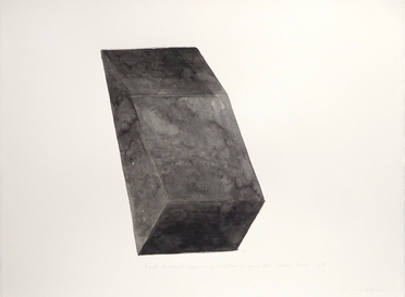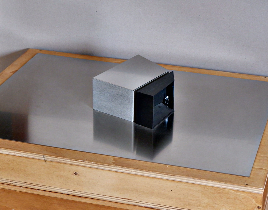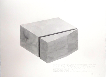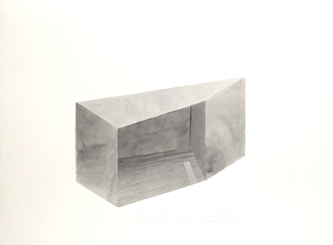 three watercolor on paper 600 g, 56 × 76 cm each, with durmast frame; one collage on a photographic print, 43 × 76 cm, with steel frame; a maquette made by steel, sandstone, wood, LED light, 8 × 76 × 56 cm.